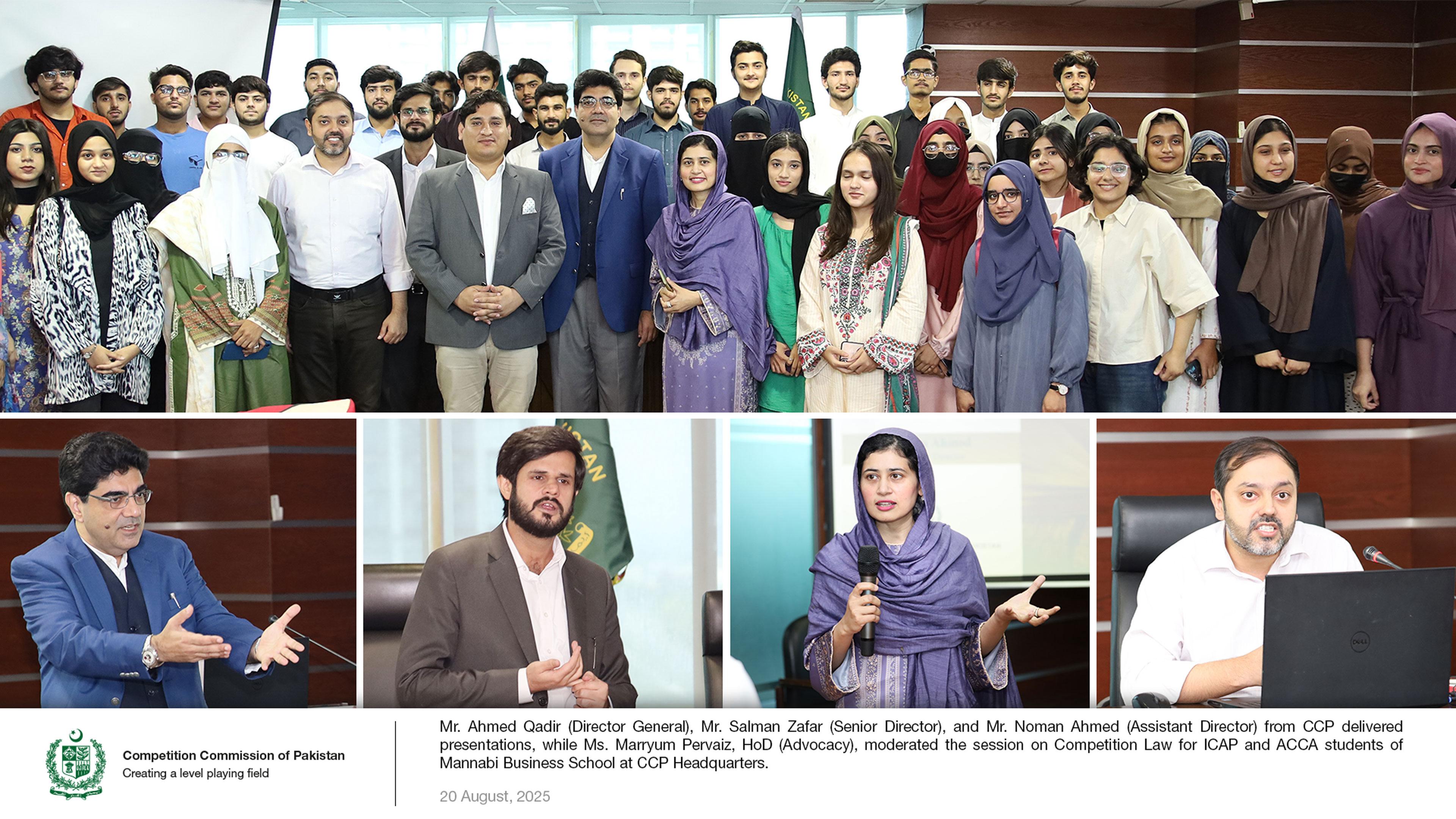 The Competition Commission of Pakistan (CCP) organized an awareness session on Competition Law for CA and ACCA students of Mannabi Business School. The session aimed to equip future finance professionals with knowledge of the legal framework that ensures fair competition in markets. Understanding Competition Law helps business and accounting students identify and avoid practices prohibited under the law, thereby fostering integrity and compliance in their future careers. CCP officials—Mr. Ahmed Qadir, Director General; Mr. Salman Zafar, Senior Director; and Mr. Noman Ahmed, Assistant Director—delivered presentations on key areas of Competition Law. These included abuse of dominant position, cartelization, deceptive marketing practices, and mergers & acquisitions. They also explained the history and importance of competition law in promoting fair and transparent market practices, protecting consumer welfare, and supporting sustainable economic growth. The session generated strong interest among the students, who actively engaged in discussions and posed thoughtful questions regarding the CCP’s enforcement mechanisms. These queries were comprehensively addressed by the Commission’s representatives. Mr. Anas Khan, Head of the ACCA Department and Mannabi Industry Linkages & Employability, along with faculty members, thanked the CCP team for engaging with students and promoting awareness of Competition Law.